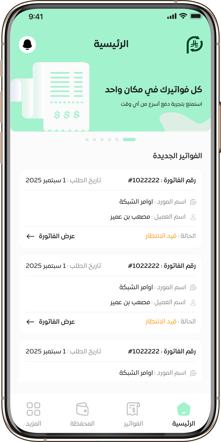 رحلة الفاتورة تبدأ من المورد وتنتهي بالتسوية، مع محفظة إلكترونية للمستخدمين، وإدارة شاملة للمدفوعات النقدية والإلكترونية.